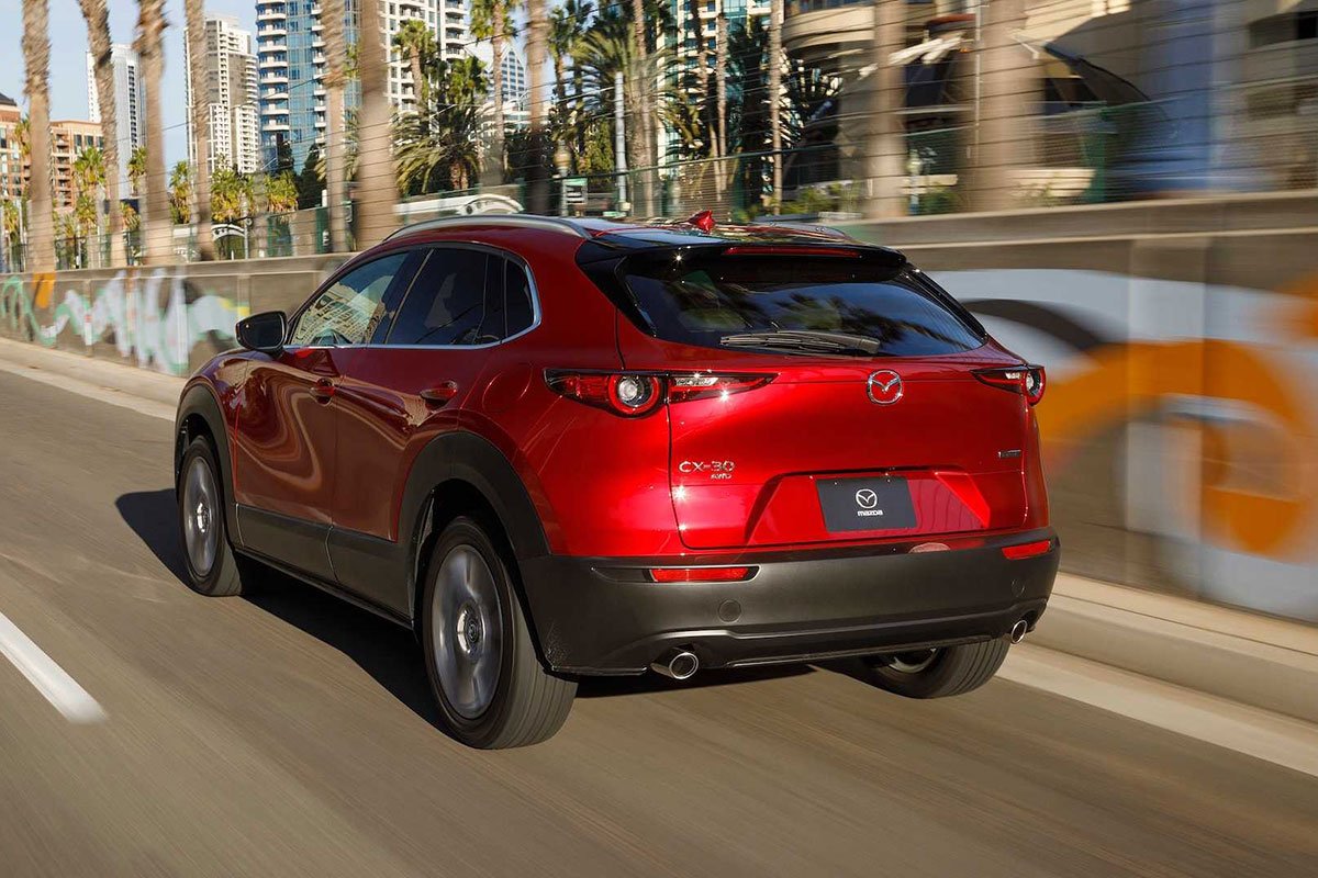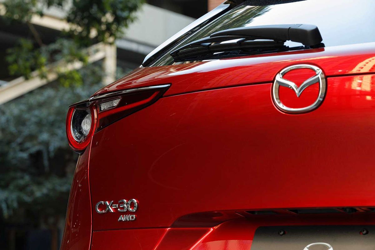 Nhìn từ sau, CX-30 ra dáng một chiếc SUV nhờ phần ốp cản to bản sơn đen mạnh mẽ, cứng cáp. Thêm vào đó, xe còn hệ thống ống xả kép dạng tròn bố trí đối xứng hai bên và cánh hướng gió sơn đen cỡ lớn mang đậm phong cách thể thao. Tuy nhiên, chi tiết cuốn hút nhất phải kể đến chính là đèn hậu LED dạng vòng tròn.