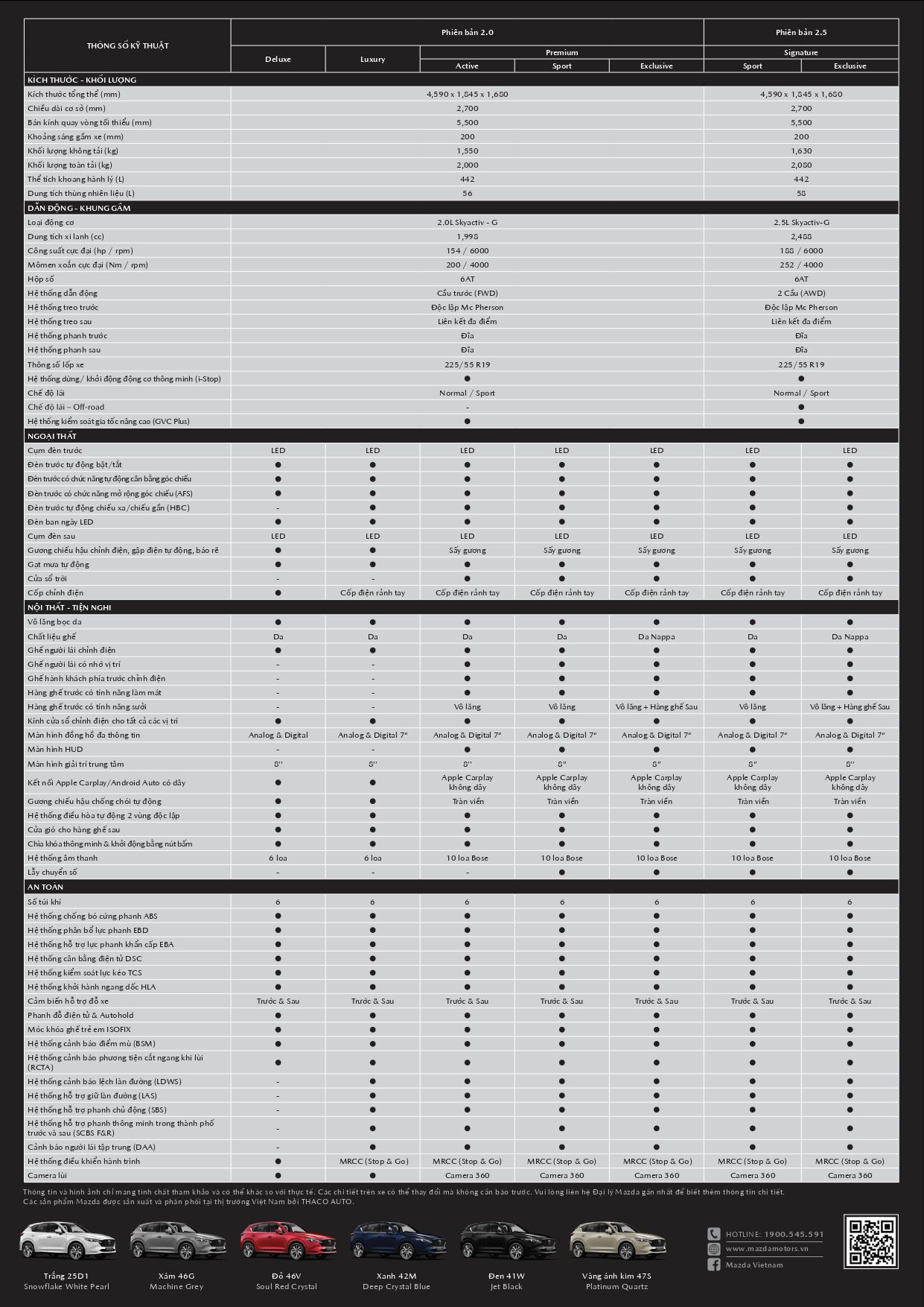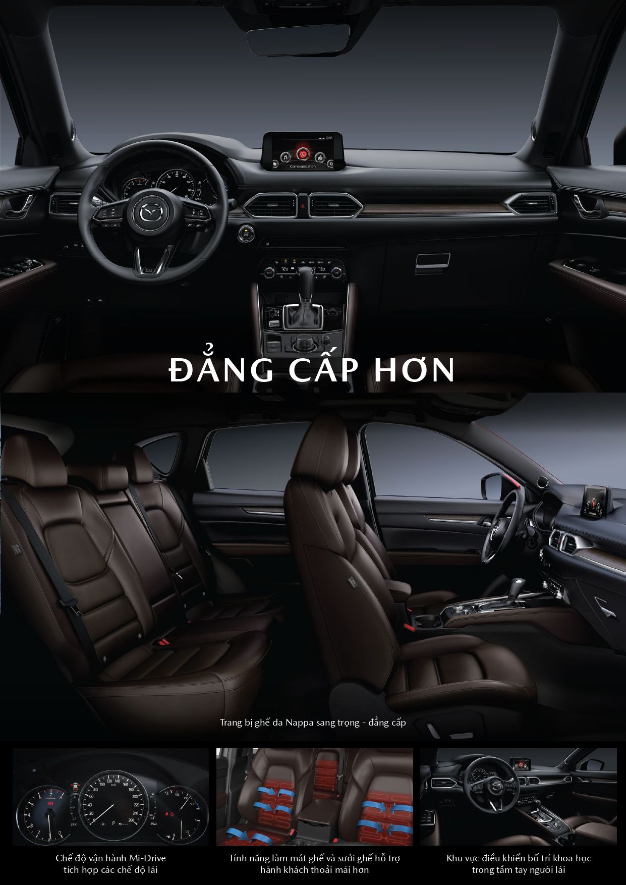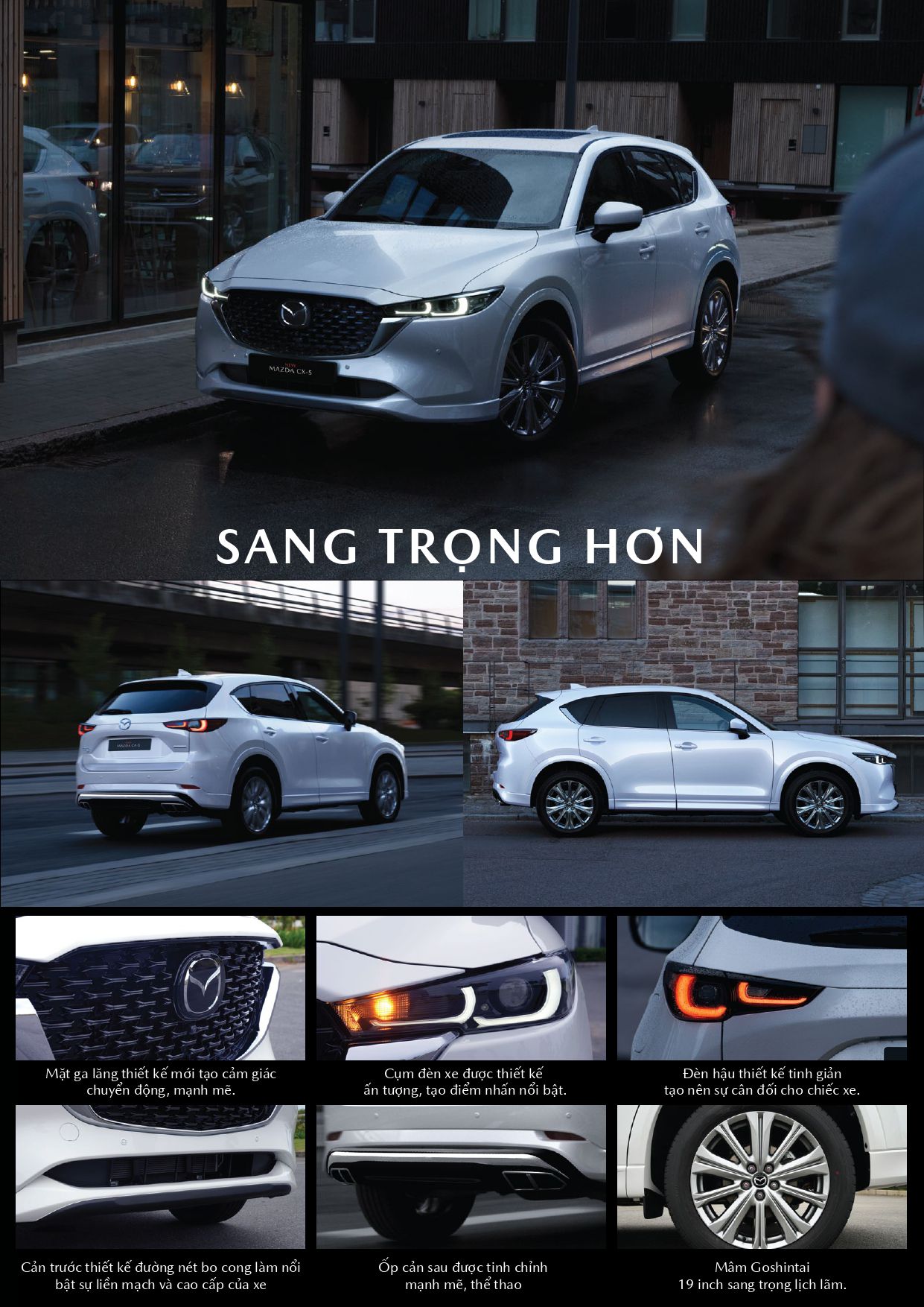 New Mazda CX-5  ra mắt thị trường Việt Nam với nhiều nâng cấp trang bị tiện nghi, đáng chú ý trong đó là hệ thống an toàn chủ động i-Activsense đã được trang bị. New Mazda CX-5 2023 được bản ra với 3 phiên bản, riêng phiên bản Premium sẽ có hai lựa chọn là Sport và Exclusive, tuỳ chọn hướng đến nhóm khách hàng thích phong cách thể thao hoặc nội thất tiện nghi với ghế bọc da Nappa và ốp gỗ tự nhiên.